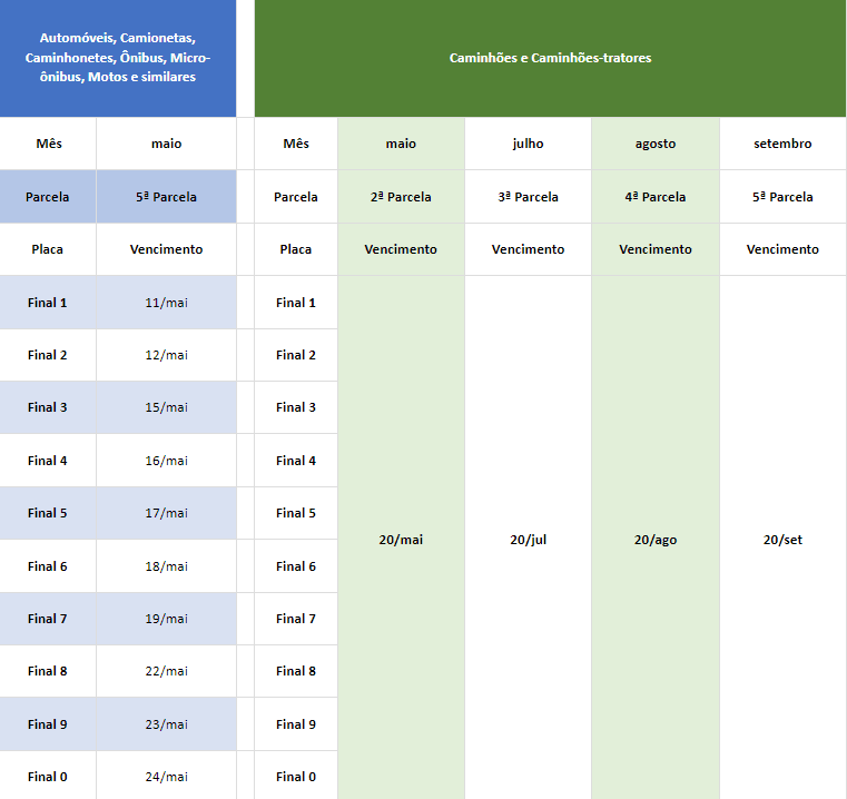 Os caminhões têm prazos diferenciados e a segunda parcela deve ser recolhia até 20 de maio – o calendário completo pode ser conferido abaixo.