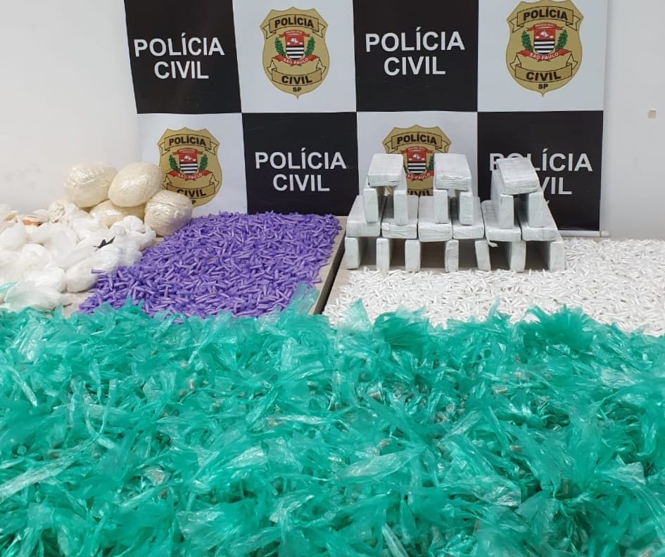 No total, foram apreendidos mais de 10 mil pinos de cocaína, 8 mil porções e 22 tijolos de maconha e 5,7 mil pedras de crack, que pesaram 43,3 quilos. O automóvel e os celulares dos suspeitos também foram recolhidos.