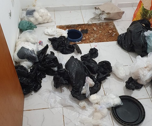 A dupla foi abordada e presa no local. Durante a vistoria, os agentes notaram azulejos com fundos falsos nos quartos da casa, que escondiam tonéis com drogas embaladas e prontas para venda. Também foi encontrada uma conta de água com um segundo endereço, no bairro Jardim Granja, onde mais entorpecentes foram localizados.