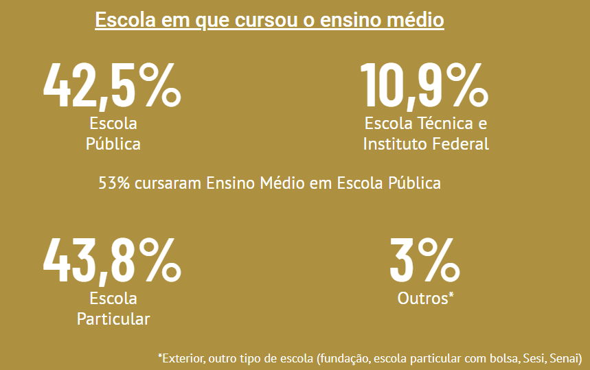 Em relação ao tipo de escola em que cursaram o Ensino Médio, 43,8% dos respondentes afirmaram terem estudado em escola particular, sendo 42,1% em escola pública e 10,9% em escola técnica e instituto federal. Os demais estudaram no exterior, com bolsa ou em fundações como Sesi e Senai.
