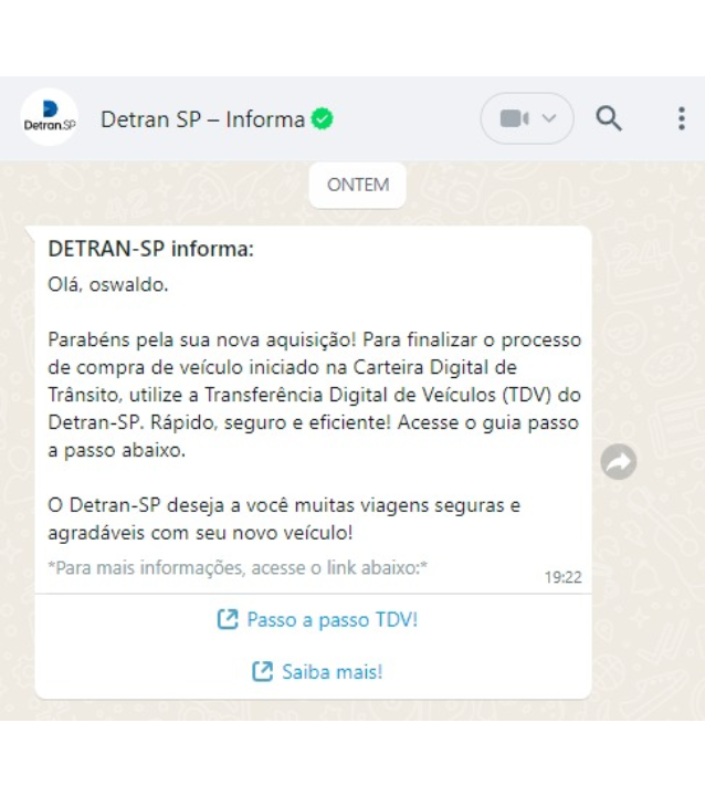 “Detran-SP informa”, abre o texto. “Olá. Parabéns pela sua nova aquisição! Para finalizar o processo de compra de veículo iniciado na Carteira Digital de Trânsito, utilize a Transferência Digital de Veículos (TDV) do Detran-SP. Rápido, seguro e eficiente! Acesse o guia passo a passo abaixo.” A mensagem termina com votos de viagens seguras e agradáveis no novo veículo e dois links: um para um vídeo com o passo a passo mencionado no texto, uma forma de ajudar o motorista na transferência, e outro vinculado à página da internet dedicada à TDV.