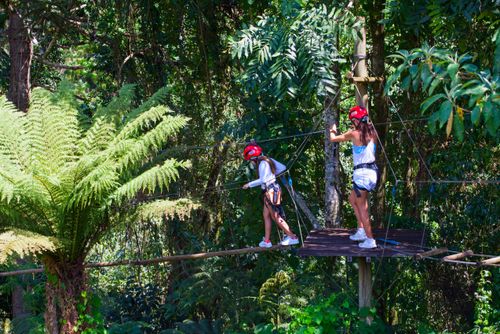 Mulher e garota praticando arvorismo no Roteiro do Vinho em São Roque