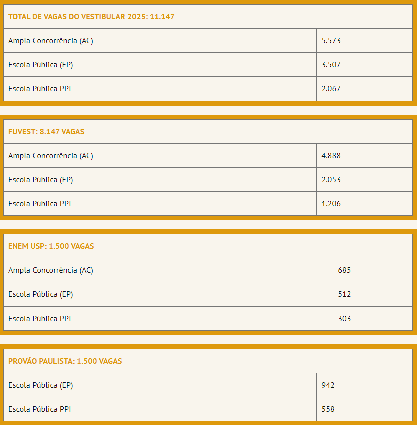 Para a seleção pelo vestibular da Fuvest serão oferecidas 8.147 vagas, das quais 4.888 serão reservadas para candidatos na modalidade Ampla Concorrência; 2.053 vagas para candidatos egressos da escola pública (EP); e 1.206 para EP/PPI. Para a seleção do Enem USP estão sendo destinadas 1.500 vagas: 685 serão para Ampla Concorrência; 512 para estudantes EP e 303 para estudantes EP/PPI.