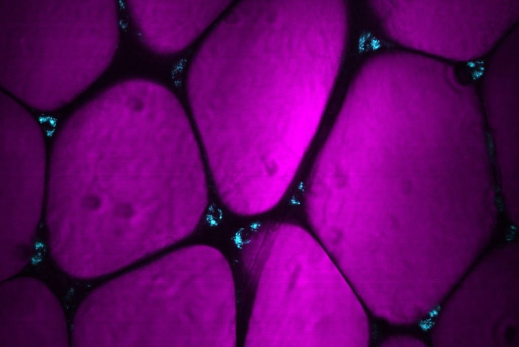 Imagem de tecido adiposo de camundongos saudáveis obtida por microscopia de autofluorescência. Em magenta, os adipócitos; em ciano, mitocôndrias de macrófagos associados ao tecido adiposo