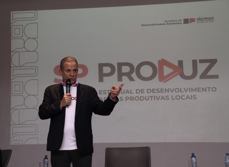 Secretário de Desenvolvimento Econômico do Estado de São Paulo, Jorge Lima, discursa durante evento de apresentação do programa SP Produz