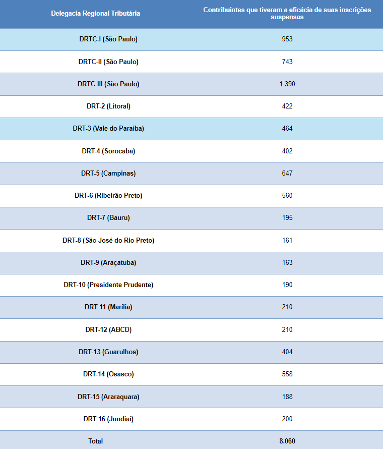 A Secretaria da Fazenda e Planejamento do Estado de São Paulo (Sefaz-SP) publicou nesta quarta-feira (17), no Diário Oficial do Estado, a notificação de suspensão da eficácia da Inscrição Estadual (IE) de 8.060 contribuintes paulistas por omissão consecutiva na entrega das Guias de Informação e Apuração do ICMS (GIAs) relativas a maio, junho e julho de 2023.