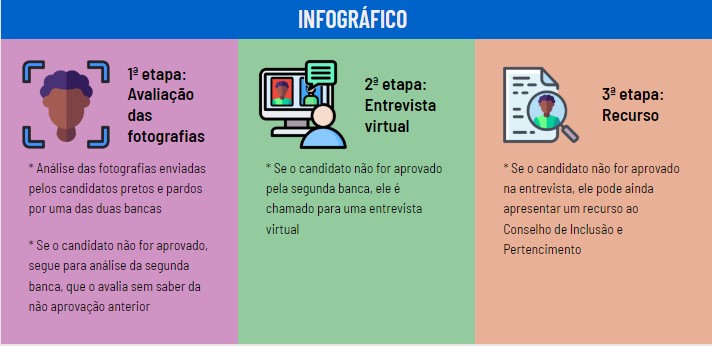 Se o candidato não for aprovado, as fotografias seguem para verificação na outra banca, que faz a avaliação sem saber da reprovação anterior. Os candidatos que também não forem aprovados pela segunda banca são convocados para uma oitiva virtual. Nesta etapa, o candidato deverá ler uma autodeclaração de pertença racial, que será gravada e avaliada por uma nova comissão, composta por cinco integrantes.