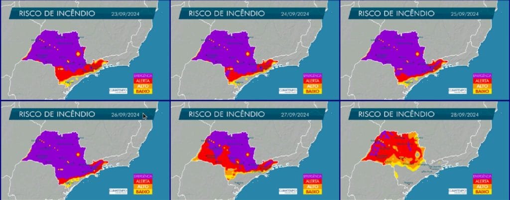 A Defesa Civil do Estado, por meio do CGE (Centro de Gerenciamento de Emergências), alerta para risco de incêndio entre segunda-feira, 23 e quinta-feira, 26, em todo estado de São Paulo, exceto o litoral paulista.