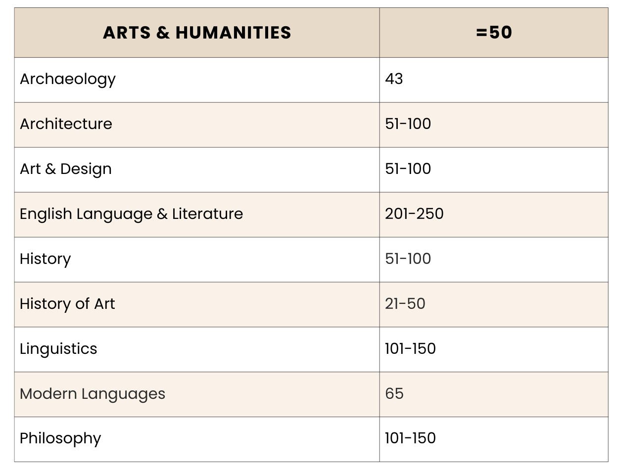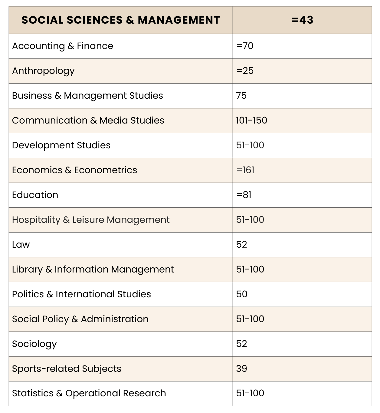 As áreas específicas são agrupadas em cinco grandes áreas e a USP está entre as 100 melhores na classificação geral de todas as cinco: Ciência Social e Administração (43ª), Artes e Humanidades (50ª), Ciências da Vida e Medicina (47), Ciências Naturais (70ª) e Engenharia e Tecnologia (67ª).