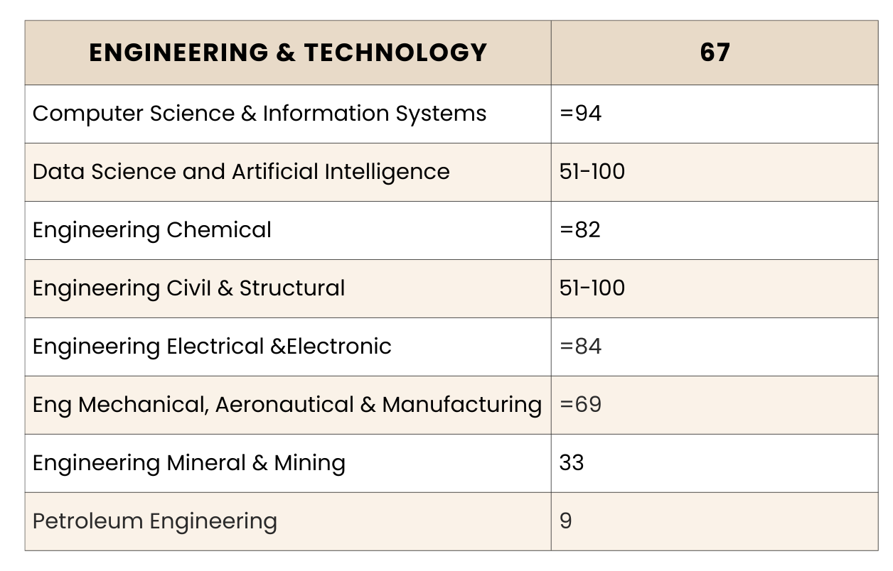 Em 30 áreas específicas a Universidade ficou entre a 51ª e a 100ª posição; em oito áreas, entre as 150 melhores; e, em duas áreas, entre as 250 melhores.