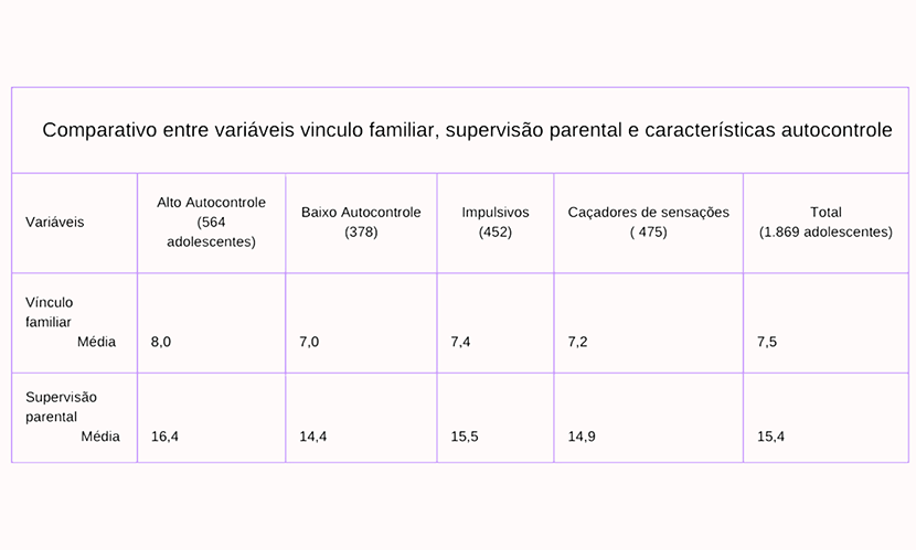 Considerando aspectos familiares, os adolescentes do grupo Alto Autocontrole pontuaram mais alto para vínculo familiar e supervisão parental do que os outros três grupos (Baixo Autocontrole, Impulsivos e Buscadores de Sensações) e também revelaram menos envolvimento em delitos que os outros grupos. Os adolescentes com Baixo Autocontrole relataram as maiores taxas de infração, seguido pelos Buscadores de Sensações, que pontuaram mais do que Baixo Autocontrole e Impulsivos.