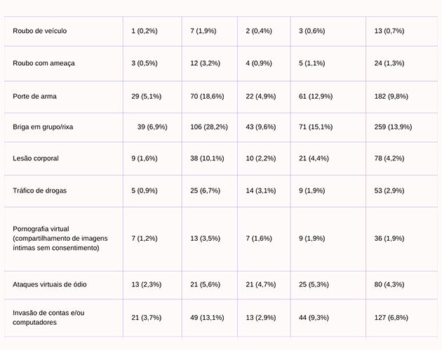 Na amostra geral, os delitos mais comuns relatados pelos adolescentes, cometidos no último ano foram brigas de grupo (7,3%), porte de arma (5,2%), pichações (4,9%), furtos em lojas (4,0%), hacking (3,4%) e vandalismo (2,7%). Ao analisar a prevalência ao longo da vida, as infrações relatadas foram as mesmas, mas em ordem diferente: brigas de grupo (13,9%), furtos em lojas (11,0%), porte de armas (9,8%), pichações (8,0%), pirataria (6,8%) e vandalismo (6,0%).