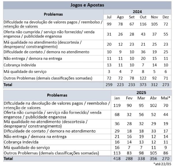 De janeiro de 2024 a março de 2025, foram registradas cerca de 3.300 reclamações relacionadas a apostas online, sendo que a maior parte se refere à não devolução de valores ou não pagamento de prêmios.