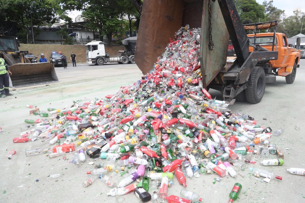 A Polícia Civil de São Paulo realizou, nesta quarta-feira (15), a destruição de mais de 100 mil garrafas. Foto: Divulgação/Governo de SP