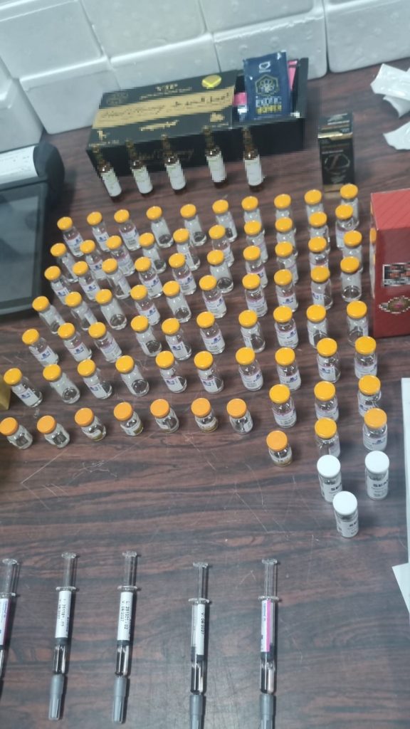 Ao todo, foram apreendidas cerca de 60 canetas e ampolas de substâncias emagrecedoras, além de mais de 100 seringas, sendo algumas descartadas após o uso e outras ainda embaladas.