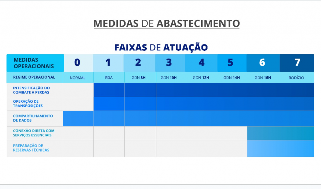 Nas faixas 1 a 3, o foco é em prevenção, consumo racional de água e combate a perdas na distribuição. As faixas 1 e 2 estabelecem o Regime Diferenciado de Abastecimento (RDA) e a gestão de demanda noturna (GDN) de 8 horas, respectivamente.