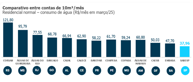 Os moradores atendidos pela Sabesp pagam atualmente a menor tarifa entre as 20 maiores operadoras de saneamento do país, segundo levantamento comparativo do setor. Enquanto a tarifa residencial da empresa paulista é de R$ 37,96 para um consumo de 10 mil litros de água por mês, em outras capitais o valor praticado pode triplicar. Em Belo Horizonte, pode chegar a R$ 59,24; em Brasília, R$ 50,03, e no Rio Grande do Sul a conta pode atingir R$ 121,80.