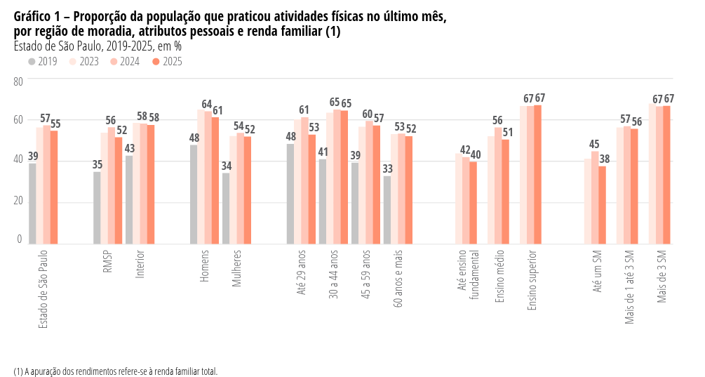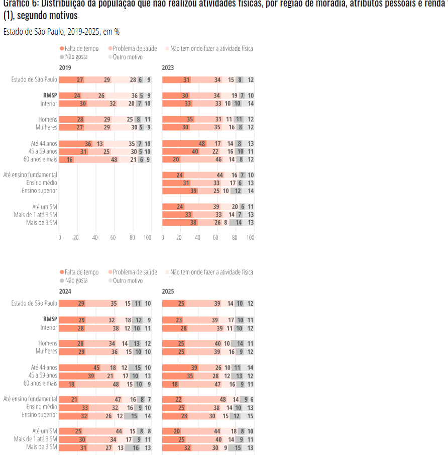 “Os dados revelam que o hábito de se exercitar está consolidado entre boa parte da população, mas ainda há desafios em segmentos com menor renda e escolaridade, especialmente entre os mais jovens”, destaca o estudo da Fundação Seade.