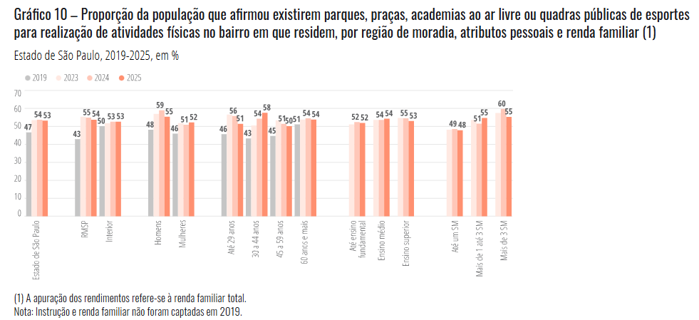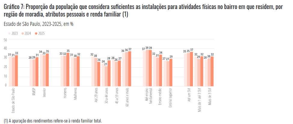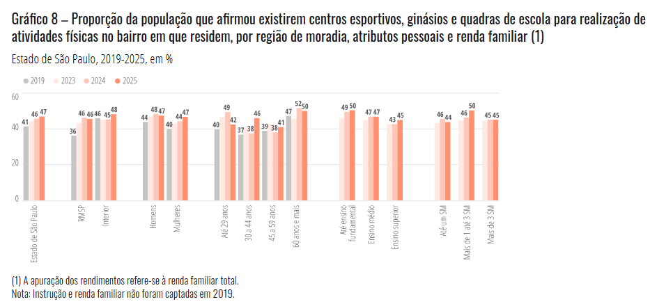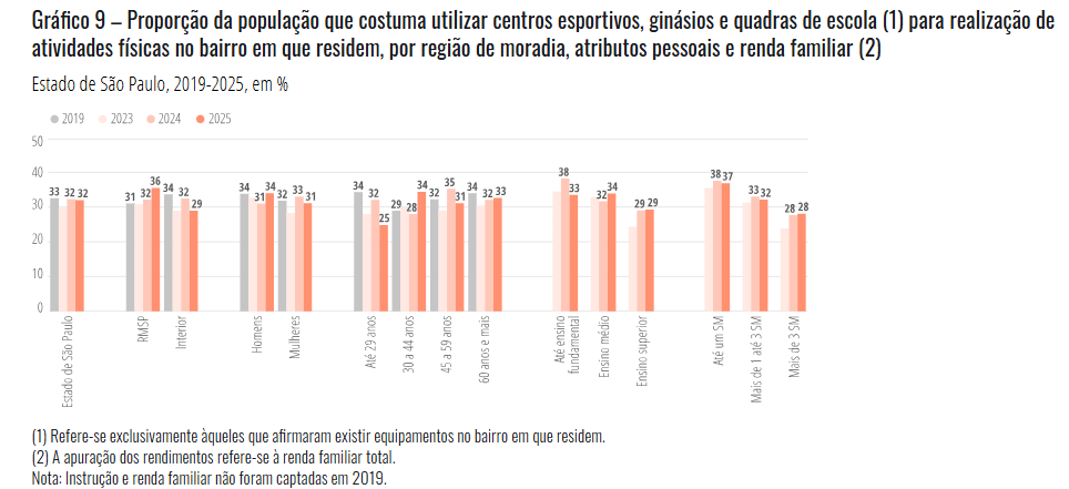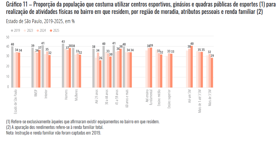 O estudo também mostra que um terço dos entrevistados (33%) considera suficientes as instalações esportivas em seu bairro e 47% identifiquem a existência de centros esportivos ou quadras públicas perto da sua moradia, embora apenas 32% os utilizem. Esses espaços, segundo o levantamento, são mais usados por pessoas de menor renda familiar, o que reforça a importância da oferta de equipamentos públicos para incentivar hábitos saudáveis.