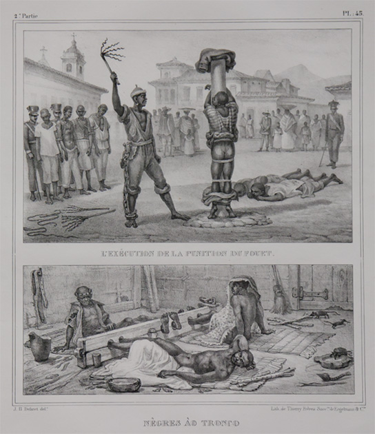 O artista aplicou as fotos em uma superfície revestida por fitas adesivas. Para fazer uma ligação com o passado, ele nomeia essas imagens atuais por meio de títulos das gravuras de Debret, como Negros ao Tronco e Aplicação do Castigo de Açoite. Assim a provocação é feita. A posição que o homem negro se encontra nas fotografias modernas é similar, se não igual, à vista na obra do artista francês do século 19. Ao observar a sobreposição entre passado e presente, o visitante pode questionar se houve mudança no Brasil ou não.