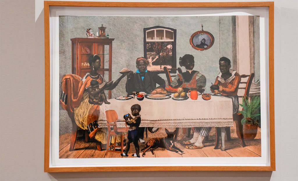 Partindo da gravura Um Jantar Brasileiro, de Debret, em que os personagens negros escravizados estão a serviço em volta da mesa, Viana remonta a cena. Agora, com o título Sentem para Jantar, a artista coloca uma família negra sentada à mesa, em um momento de união.