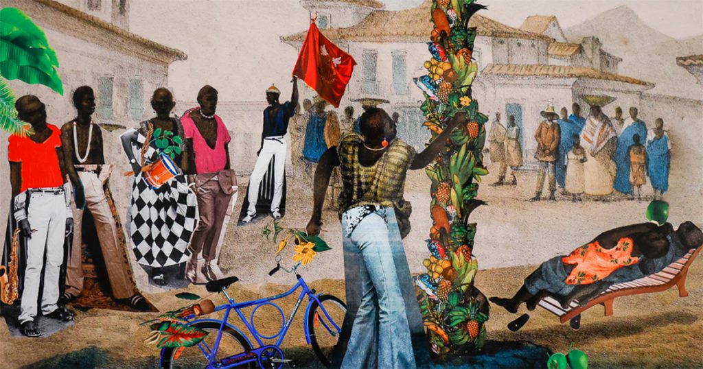 “A Gê pega imagens de sofrimento e opressão para transformar em imagens de celebração, de festa, de abundância, de cor, de alegria. Abre uma perspectiva otimista em relação a um presente, a um futuro, a um novo tempo”, analisa a curadora Gabriela Longman. A artista reposiciona o protagonismo negro, que na obra de Debret aparece num lugar de dor, situando-o num espaço de celebração. Gê Viana é uma das artistas que estão na pesquisa de Jacques Leenhardt desde o começo, presente no mapeamento inicial do livro.