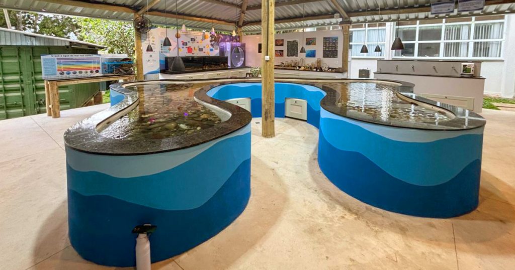 O espaço conta com monitores de TV, microscópios, tablets, óculos de realidade virtual, aquários e um tanque com animais marinhos do litoral norte, além de um conjunto de painéis com imagens e informações sobre a biodiversidade, os ecossistemas e as áreas marinhas protegidas da região.
