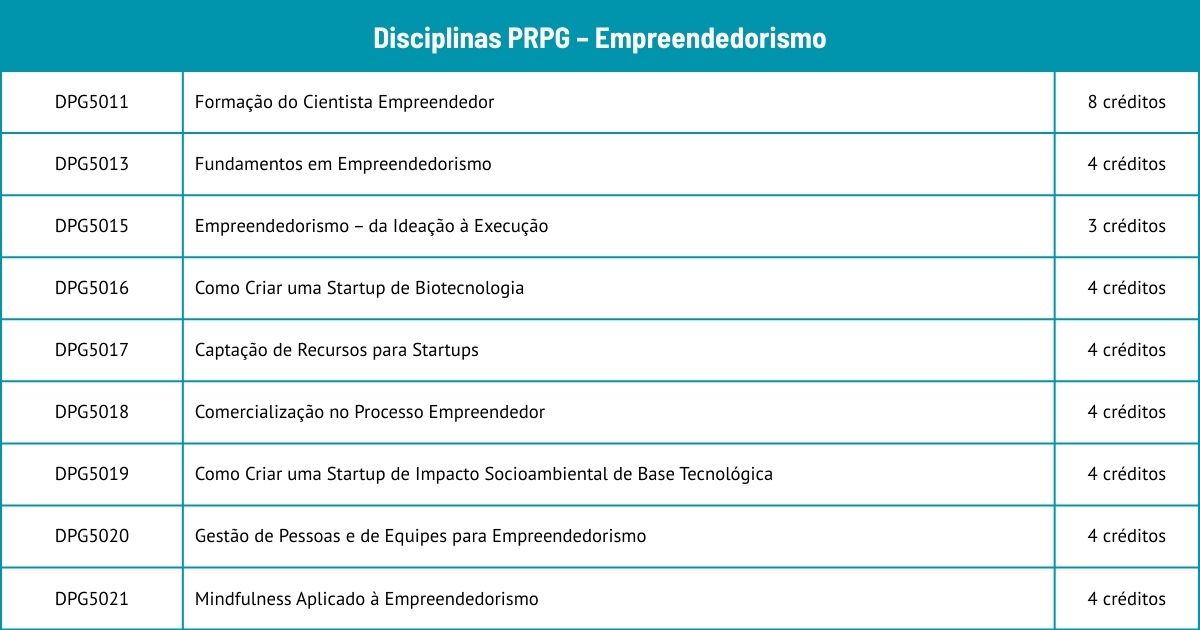 Com a proposta de promover uma cultura empreendedora entre pós-graduandos, com foco na inovação científica e impacto social, a Pró-Reitoria de Pós-Graduação (PRPG) desenvolveu nove disciplinas exclusivas, voltadas ao empreendedorismo.