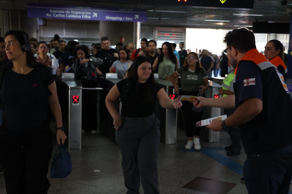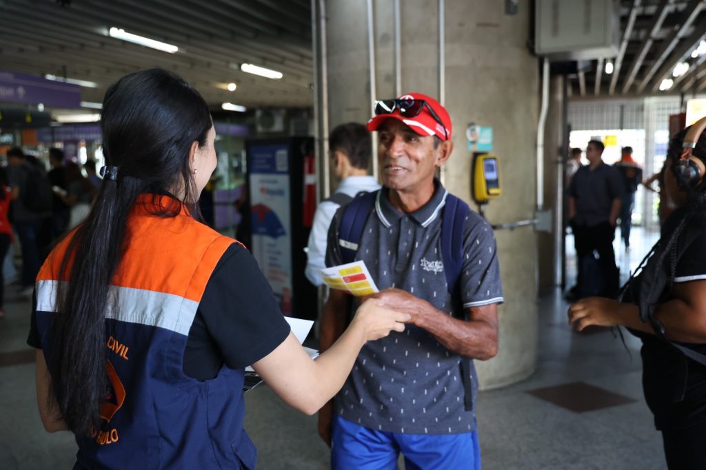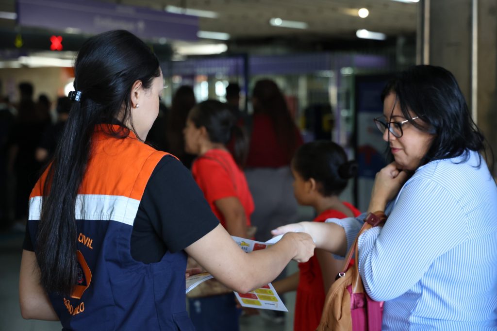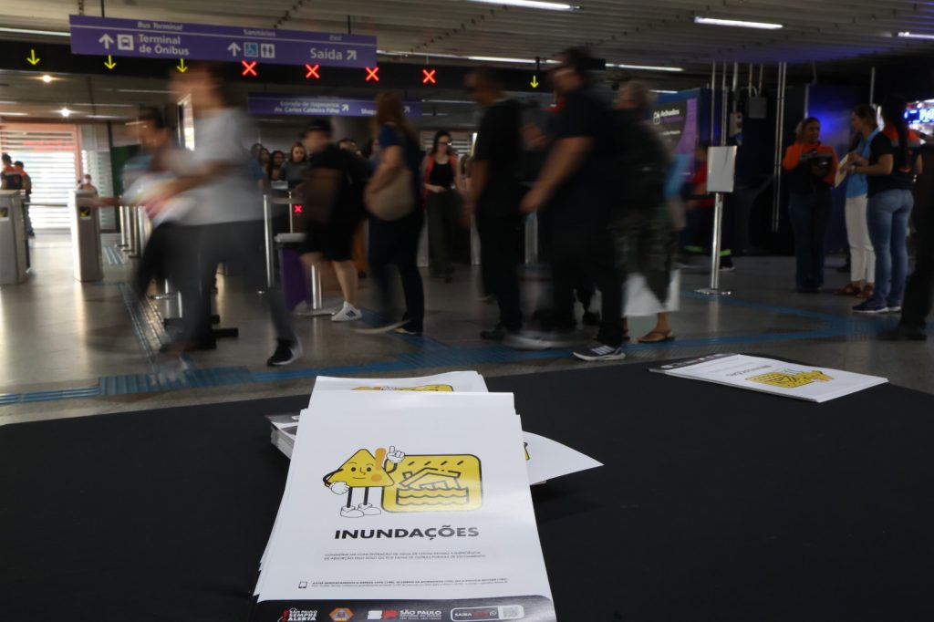 A Defesa Civil do Estado realiza na estação Campo Limpo, da Linha 5-Lilás da ViaMobilidade, na zona sul de São Paulo, uma ação de conscientização e prevenção contra os riscos dos alagamentos e enxurradas nesta quarta-feira (28).