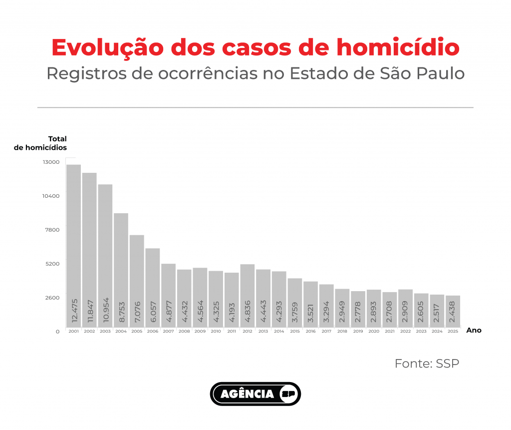 Em 2025, foram 2.438 homicídios dolosos, queda de 3,1% em relação a 2024, quando houve 2.517 registros. Assim como no caso dos latrocínios, 2001 também foi o ápice de assassinatos, com 12.475, 10 mil casos a mais do que o registrado no ano passado, queda de 80% na comparação entre os anos.