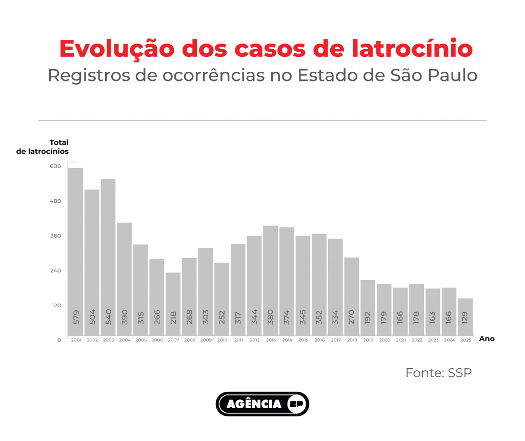 Os latrocínios também registraram a menor marca da série histórica iniciada em 2001, com queda de 22% entre 2024 e 2025, total de 129 casos. Em 2001, os paulistas conviviam com mais de um caso por dia. Naquele ano, foram 579 registros de latrocínios, que é o roubo seguido de morte da vítima.