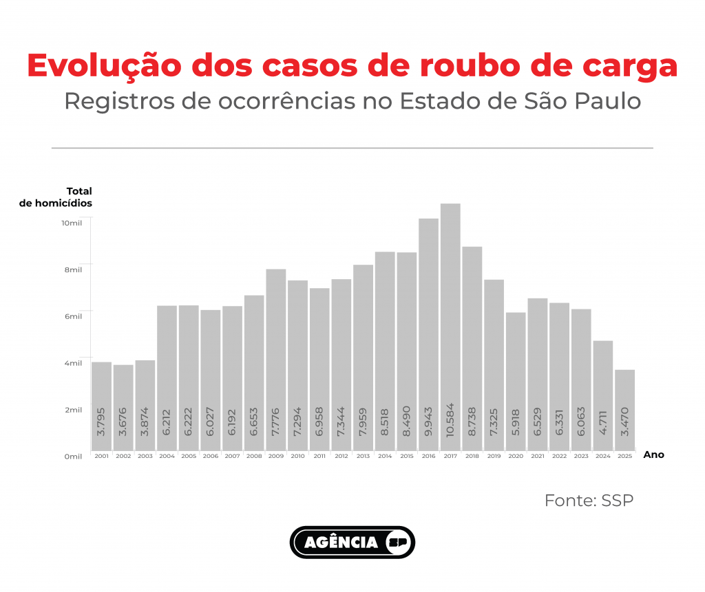Os roubos de carga caíram 26 % entre 2024 e 2025, passando de 4.711 casos para 3.470, 1.241 casos a menos. O crime também registrou o menor índice da série histórica. O ápice de casos foi em 2017, com 10.584 casos. No interior, onde o crime acontece principalmente nas estradas, a queda em roubos de carga alcança 44% entre 2024 (1.059 registros) e 2025 (589).