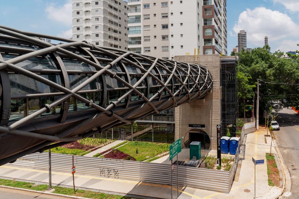 O grande diferencial técnico da Estação Campo Belo é a passarela de dois níveis, solução inédita na Linha 17‑Ouro e um dos elementos mais complexos do empreendimento. A estrutura, com 220 toneladas, 29,5 metros de comprimento e 10 metros de largura, foi instalada em três etapas entre setembro e outubro de 2024, envolvendo interdições programadas e operações noturnas com guindastes de grande porte.