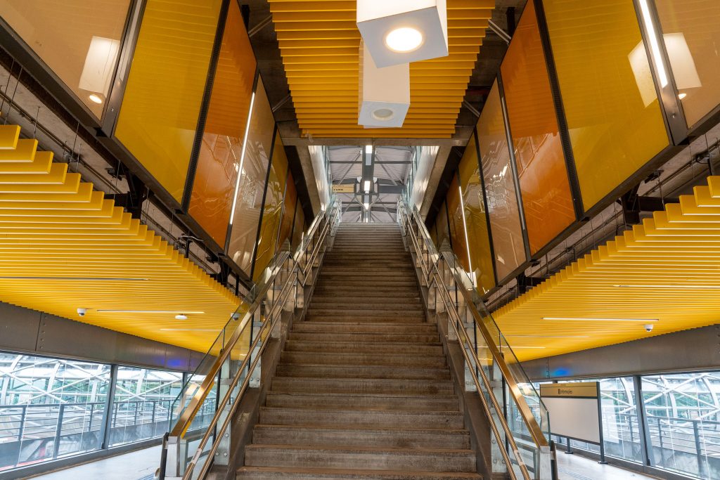 Assim como nas demais estações da linha, o projeto incorpora soluções sustentáveis, com ventilação e iluminação naturais nos espaços públicos, captação de água pluvial para limpeza e irrigação das áreas externas e paisagismo com espécies adequadas à região. A proposta contribui para o conforto ambiental, para a redução do consumo de energia e para a valorização do espaço urbano no entorno da estação.